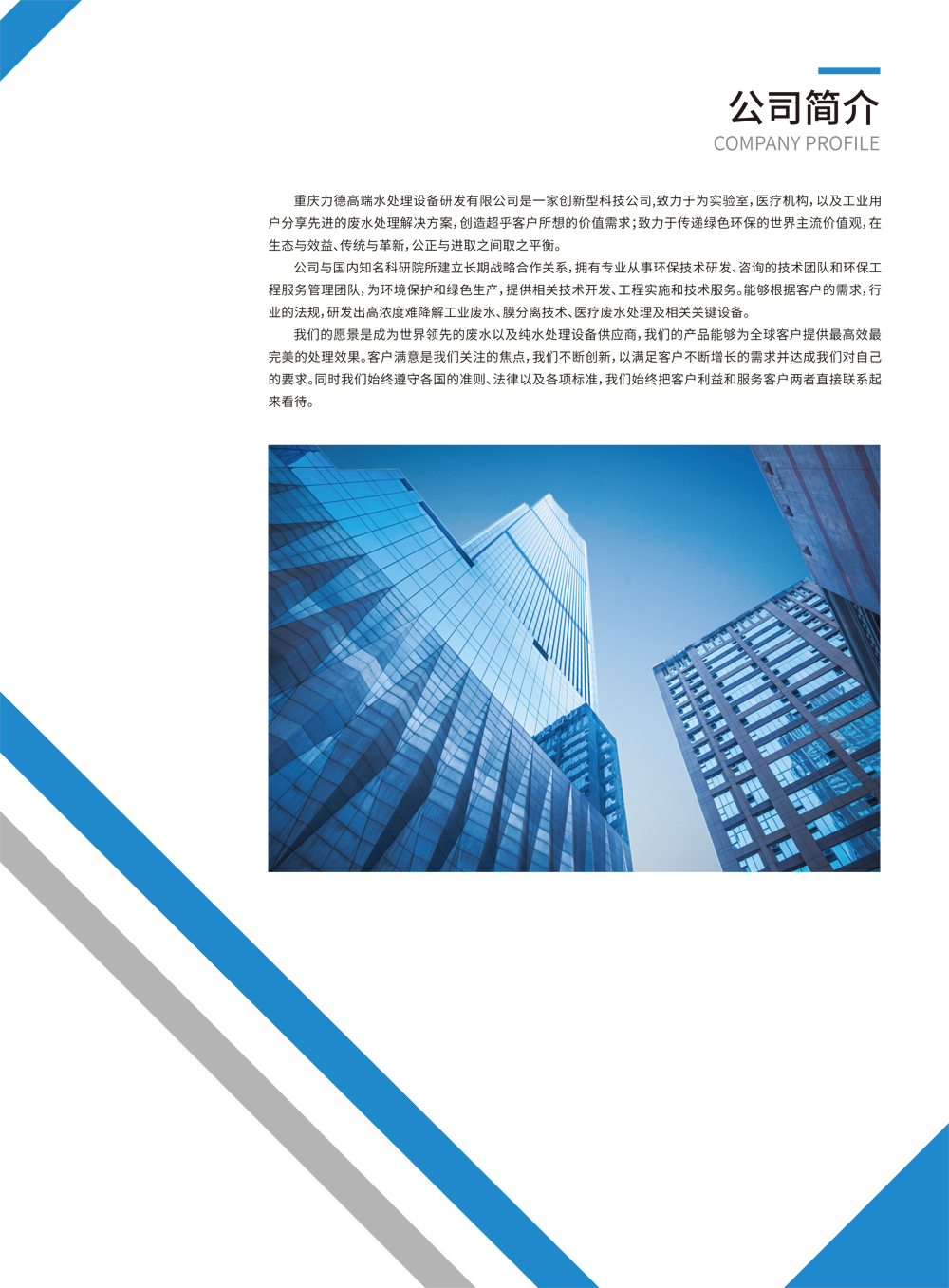 【概要描述】重慶力德高端水處理設(shè)備研發(fā)有限公司位于重慶高新區(qū)西永微電園,是一家創(chuàng)新型科技企業(yè)。公司專注于純水超純水、高濃度難降解工業(yè)廢水、膜分離技術(shù)、分戶式生活污水凈化槽、高校水智慧實(shí)訓(xùn)裝備及相關(guān)關(guān)鍵設(shè)備的研發(fā)及產(chǎn)業(yè)化。公司與國內(nèi)知名科研院所建立有長期戰(zhàn)略合作關(guān)系,擁有專業(yè)從事環(huán)保技術(shù)研發(fā)、咨詢的技術(shù)團(tuán)隊(duì)和環(huán)保工程服務(wù)管理團(tuán)隊(duì),公司強(qiáng)大的科研平臺(tái)和專業(yè)技術(shù)服務(wù)團(tuán)隊(duì),為環(huán)境保護(hù)和綠色生產(chǎn),提供相關(guān)技術(shù)開發(fā)、工程